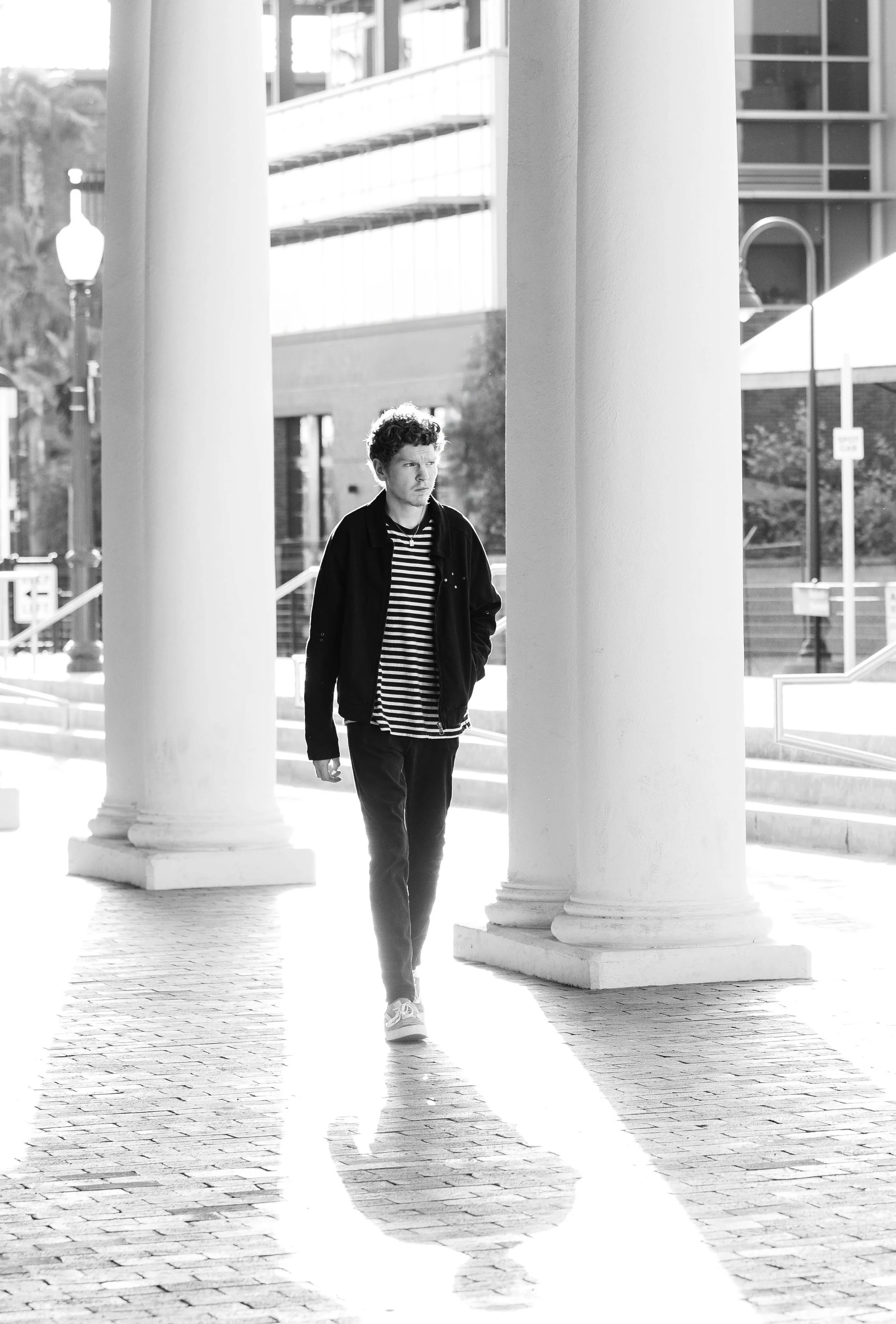 The photo shown here was captured at a local train depot. I was obsessed with the shadows and highlights created by the pillars, and had my son walk slowly toward me to showcase the contrast seen here.